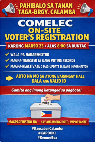 Ang COMELEC mupahigayon og On-Site Voterโs Registration dinhi sa atong barangay karong Marso 23, magsugod…
