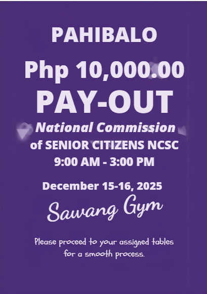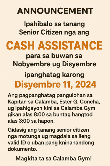 π’ ANNOUNCEMENTIpahibalo sa tanang Senior Citizen nga ang CASH ASSISTANCE para sa buwan sa Nobyembre ug Disyembre ipanghatag karong Disyembre