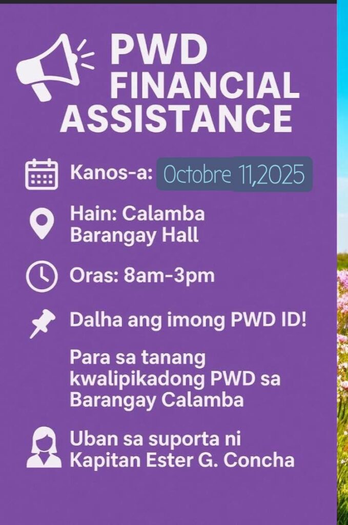 Ang Kagamhanan sa Dakbayan sa Sugbo, pinaagi sa Department of Social Welfare and Services (DSWS), magpahigayon og pag-apod-apod sa pinansyal nga tabang alang sa mga PWD karong Sabado, Oktubre 11, 2025, sa CALAMBA Barangay Hall.