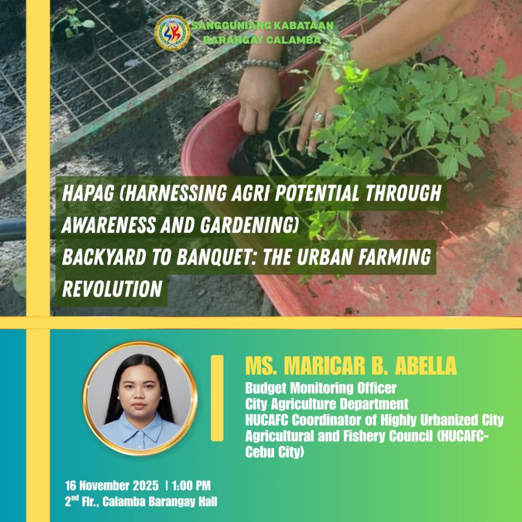 Calambahanons! Gusto ba ninyong makatabang sa pagtanom ug pag-atiman sa kalikupan? Gusto ba pud ninyong adunay masustansyang pagkaon sa inyong lamesa? Apil na sa atong Urban Farming Symposium!