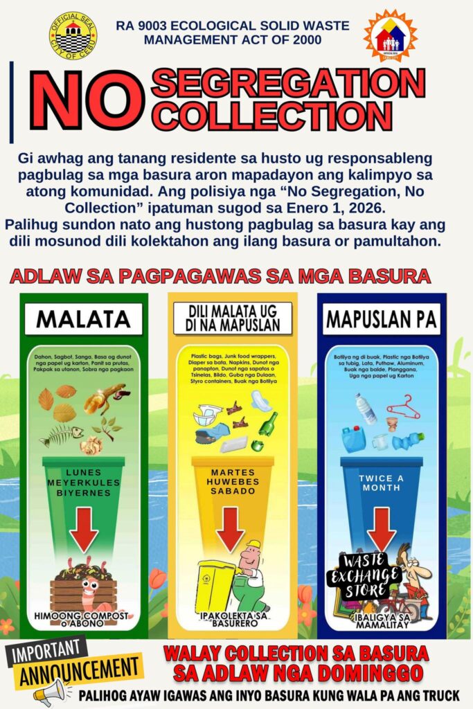 “Sa Enero 1–15, pahimangno ug pag-edukar pa lang sa katawhan. Apan sugod Enero 16, kung walay hustong segregation, dili na kolektahon ang basura,” matud ni Konsehal Bacurnay.