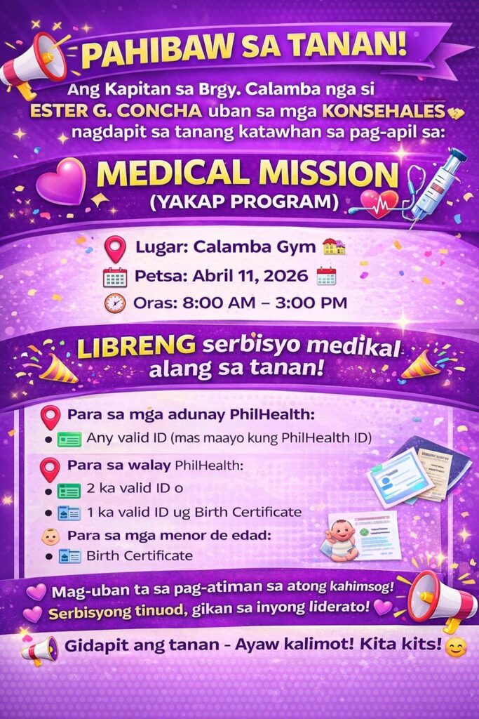 Ang Kapitan sa Brgy. Calamba nga si Ester G. Concha, uban sa mga Konsehales, nagdapit sa tanang katawhan sa pag-apil sa: