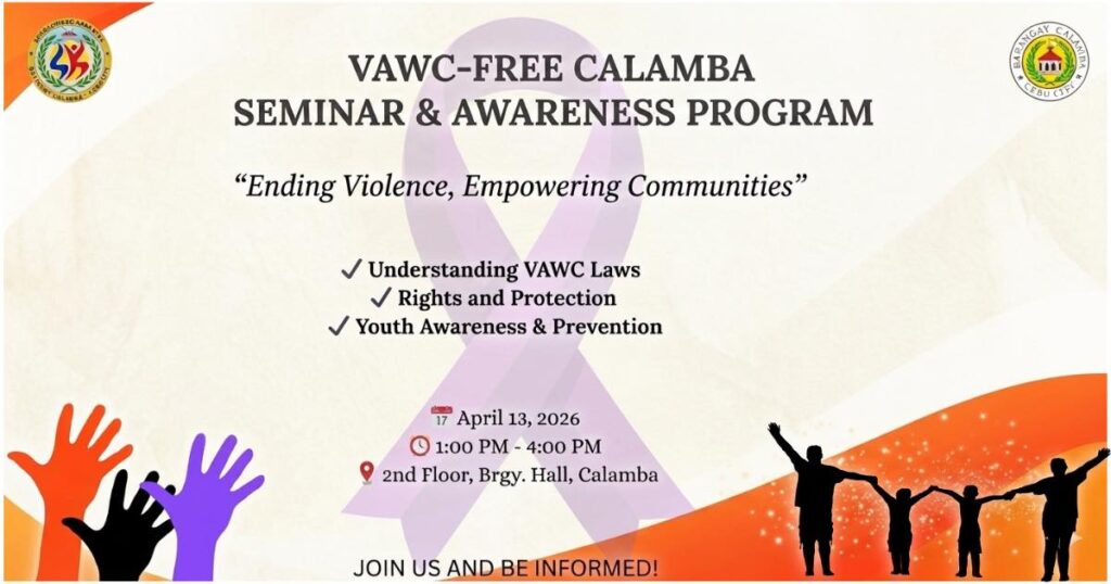 The Sangguniang Kabataan of Barangay Calamba invites everyone to join the VAWC-FREE CALAMBA: Seminar & Awareness Program.
