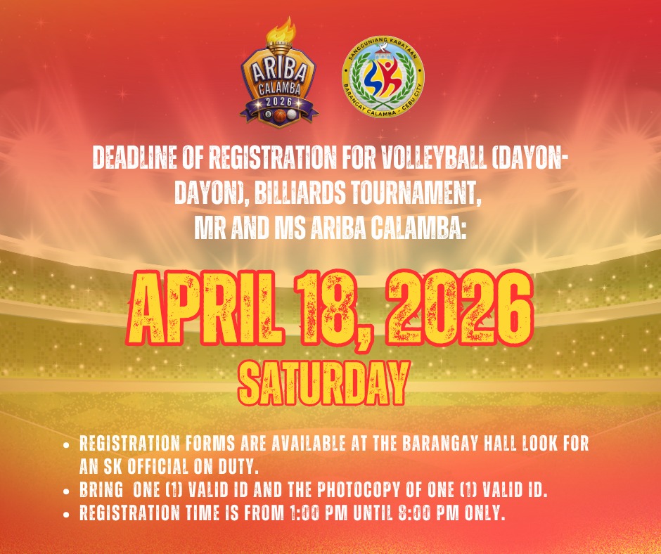 Mga ka-Calambahanon, pahibalo sa tanan nga ugmang adlawa, April 18, 2026, mao na ang last day sa registration para sa mosunod nga kalihokan: