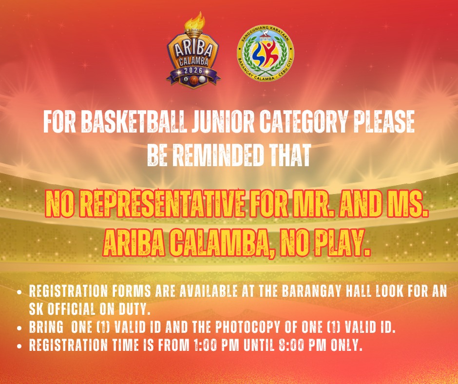 Sa tanang teams nga apil sa Basketball League – Junior Category, palihug timan-i nga kung walay official Mr. and Ms. Ariba Calamba representative ang inyong team, dili gihapon kamo makadula.