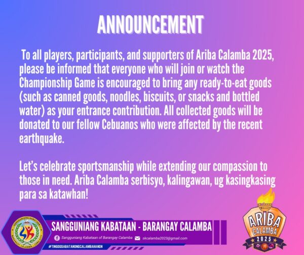 ๐ข ANNOUNCEMENT To all players, participants, and supporters of Ariba Calamba 2025, please be informed…